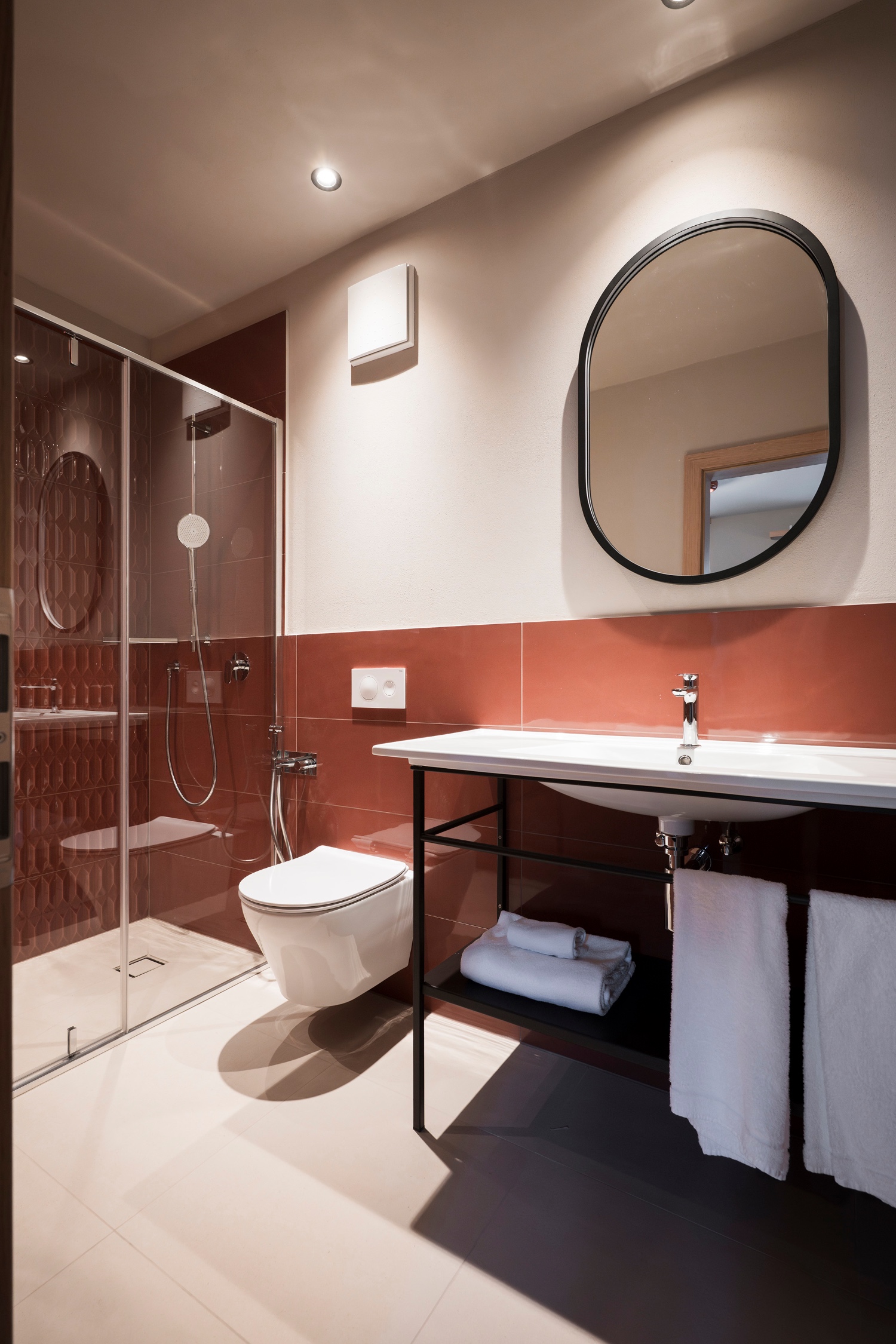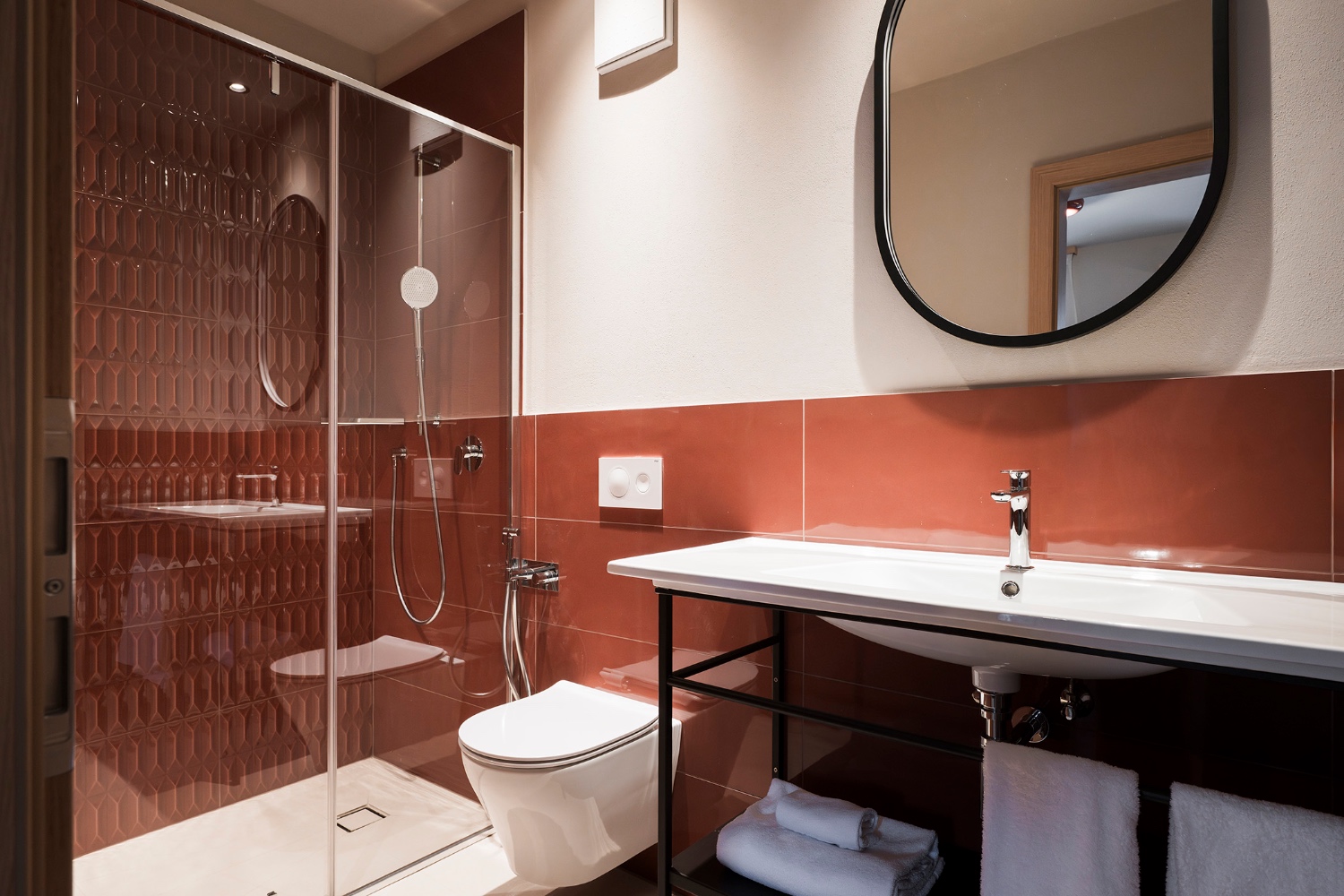 • Badezimmer mit Dusche, WC, Föhn und Handtüchern