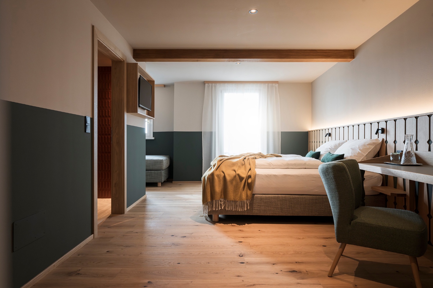 • Wohn-Schlafbereich mit Doppelbett, hochwertiger Bettwäsche und gemütlichem Sofa