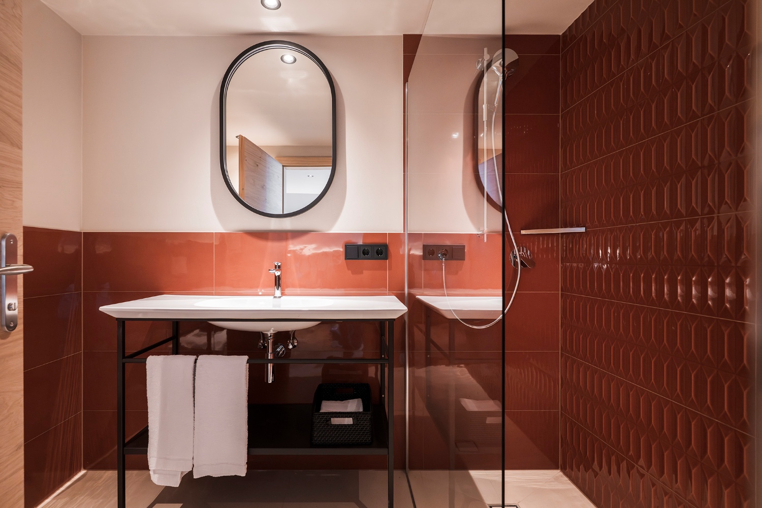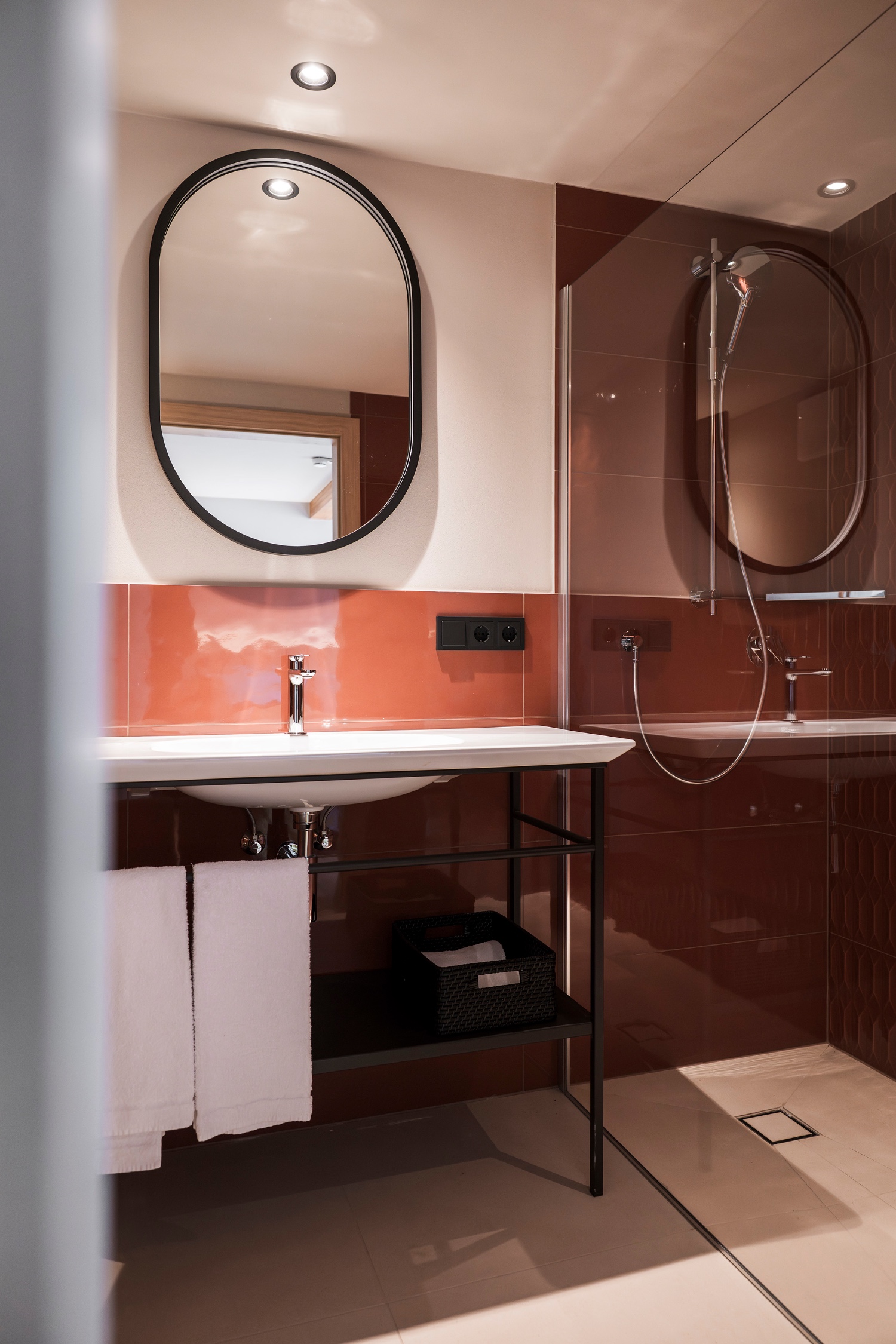 • Badezimmer mit Dusche, WC, Föhn und Handtüchern