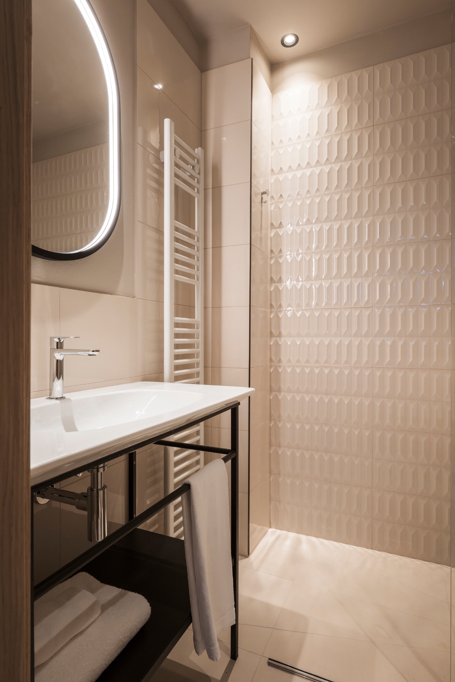 • Bathroom with shower, WC, hairdryer, and towels